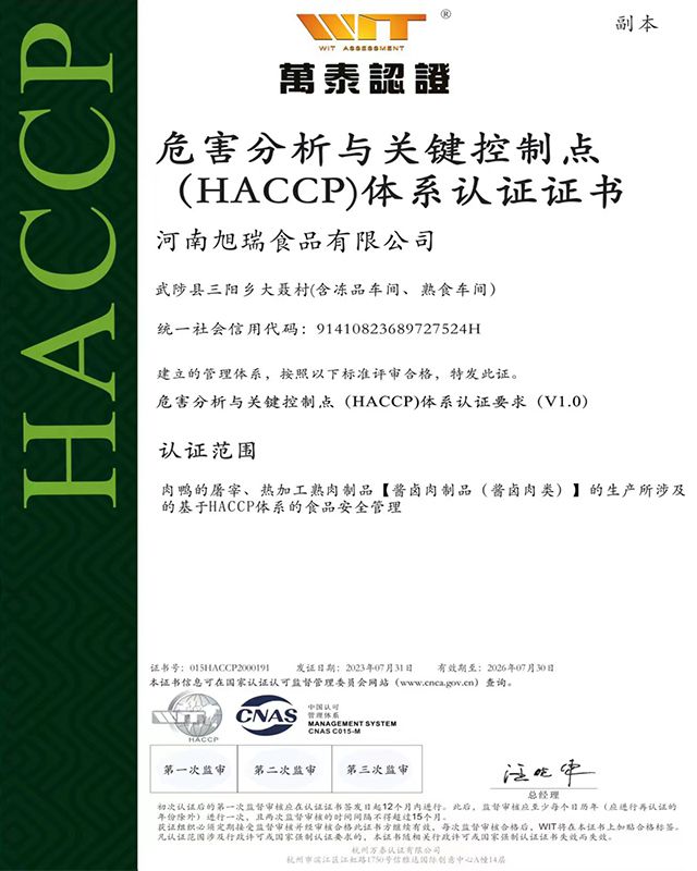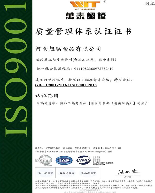 公司累計投資1.5億元,建成現(xiàn)代化屠宰加工生產(chǎn)基地,引進先進成套生產(chǎn)線,達到國內(nèi)領(lǐng)先生產(chǎn)加工水平。具備年屠宰2000萬只肉鴨生產(chǎn)能力。擁有儲存量3000噸的智能化,數(shù)字化冷鏈倉儲.產(chǎn)品分別通過ISO9001質(zhì)量管理體系、ISO22000食品安全管理體系和HACCP管理體系認證,獲得綠色食品認證和出口食品生產(chǎn)企業(yè)備案證明。
